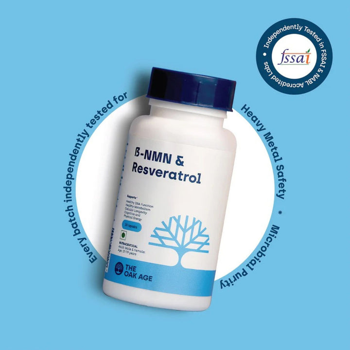 The Oak Age uses scientifically backed dosages of NMN and Resveratrol to ensure maximum efficacy. Our products are rigorously tested in FSSAI and NABL accredited labs for quality, ensuring a safe and effective supplement for your longevity needs.