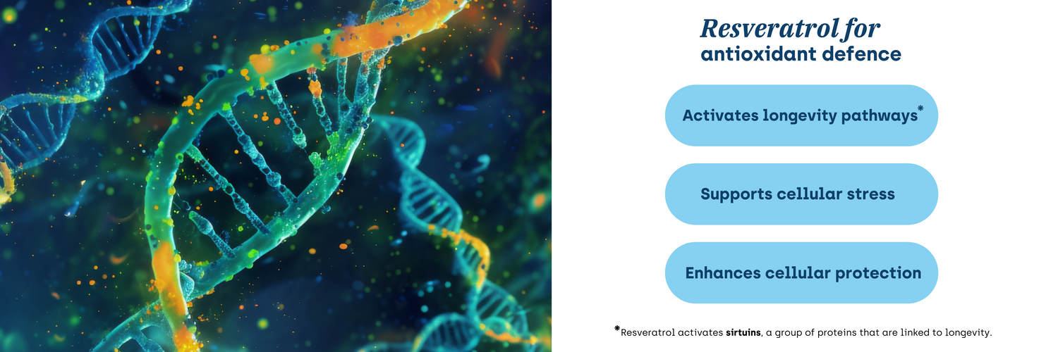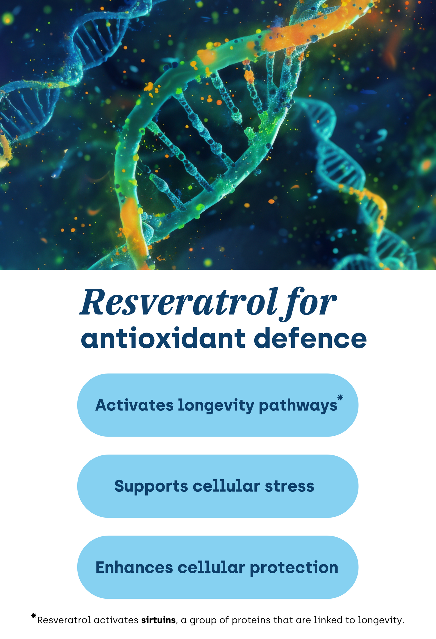 Resveratrol is a powerful antioxidant found in grapes and red wine that promotes longevity and cellular health. It activates the enzyme AMPK, which increases the body’s demand for NAD+, enhancing the effects of NMN. Resveratrol also supports heart health, reduces inflammation, and improves mitochondrial function.